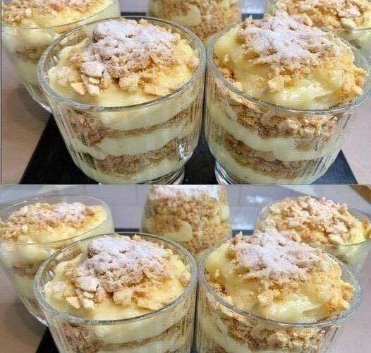 - Adicione o creme: Cubra as migalhas de biscoito com uma camada de creme de natas. Repita as camadas, alternando entre migalhas de biscoito e creme de natas, até preencher os recipientes.